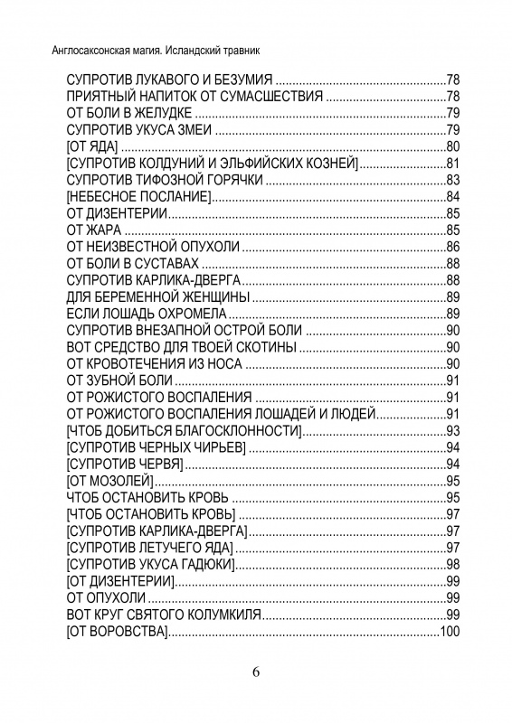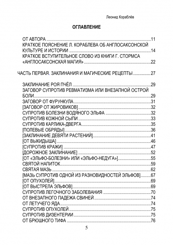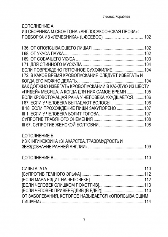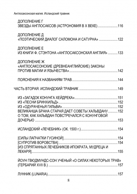 Переводы аллитеративных заклинаний, травяных рецептов и прочей магии англосаксов сделаны по работам Г. Стормса, Я. Гримма, М. Свонтона, О. Кокэйна, А. Вьятта, Ф. Марча, Ф. Клэбера, Э. Добби, Т. Райта и Дж. Райта, Дж. Кэмбла, К. Холла, Грэттана/Грэндона, Магоуна, Р. Йенте, К. Кроссли-Холланда, Д. Вайтлок, Дж. Толкина, по изданиям «Англосаксонские поэтические памятники» I-VI тома, словарю Босуорт/Толлера, энциклопедии «Британника» и др. Дан краткий словарик названий древнеанглийских (англосаксонских) трав с латинскими названиями, русскими переводами (часто с архаичными вариантами) и с древнеисландскими аналогами.