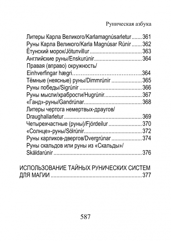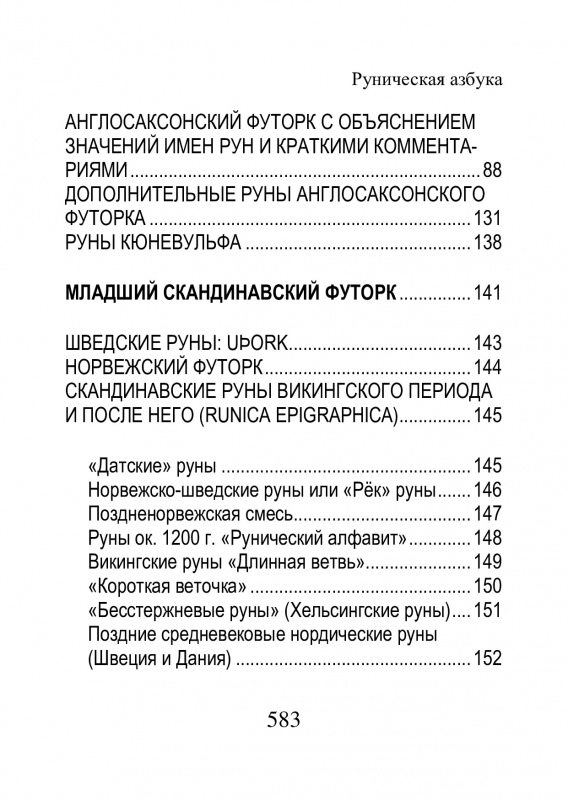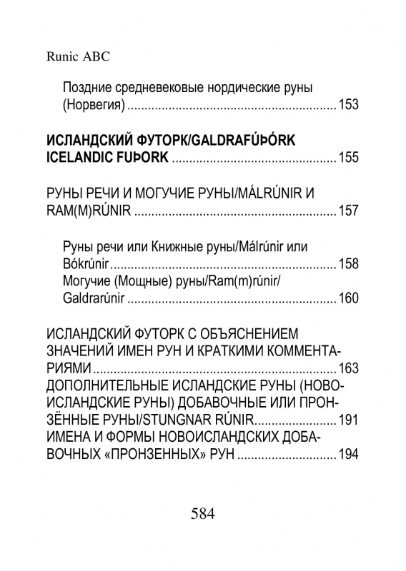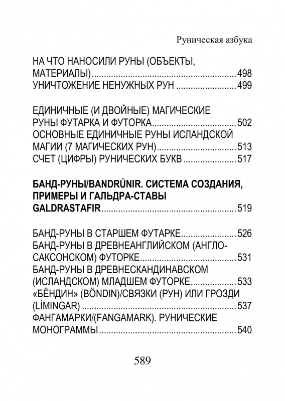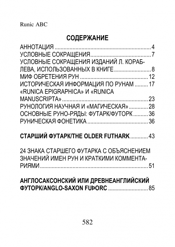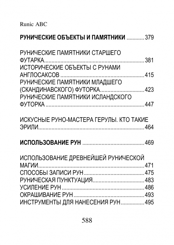 В книге есть вся основная информация о рунах от Старшего футарка до банд-рун и исландских гальдра-ставов. Из книги вы сможете узнать о теориях происхождения рун научных и мифологических (2 варианта обретения рун Одином); чем отличаются футарк и футорки; состав всех древнегерманских рунических рядов (Старший футарк, скандинавский и исландские футорки, англосаксонский футорк); полную информацию о каждой руне, составляющей рунический ряд: название, звучание, место в руно-ряде, значение, использование, как она выглядит (все варианты изображения каждой руны). В книге дана информация о рунических поэмах (в том числе шведская Поэма о рунах) и рунических кеннингах; приведены основные самые известные рунические памятники с сакральными и магическими надписями рунами разных периодов; есть раздел практического использования рун в магии и способы их усиления в магическом аспекте.