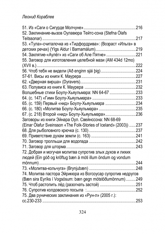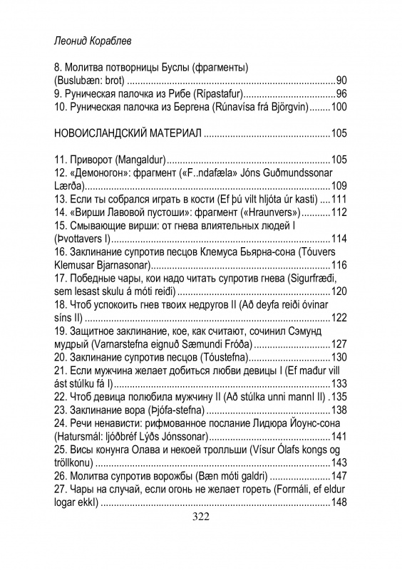 Леонид Кораблев в своей книге «Рунические заговоры и апокрифические молитвы исландцев» собрал уникальную коллекцию древнейших заговоров и апокрифических молитв, которые можно использовать и в настоящее время. Все заговоры снабжены текстом на оригинальном языке. А в конце книги прилагается коллекция заговоров, записанная рунами.